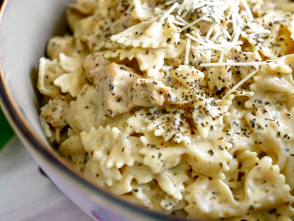 4. Setjið kjúklinginn og pastað saman við sósuna og blandið vel. Berið fram með rifnum parmesan.
