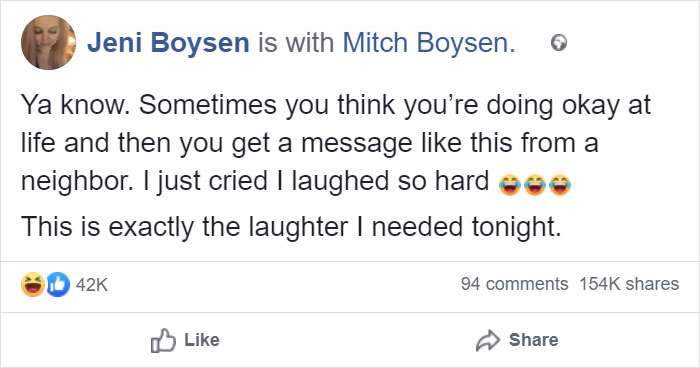 Skilaboðin komu frá Lauru sem er vinkona og nágranni hennar Jeni. Laura er einnig móðir og þekkir börnin hennar Jeni vel, svo hún gat líka séð húmorinn í þessu.