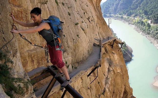 Það er ekki alveg ljóst hvað sá sem setti upp þessa gönguleið í Mount Huashan í Kína var að hugsa. Fólk gengur í um 2km hæð (7000fet) á örlitlum trégöngustíg sem er kominn til ára sinna. Vissulega eru allir vel bundnir en samt þarf mikið hugrekki til að taka fyrstu skrefin.