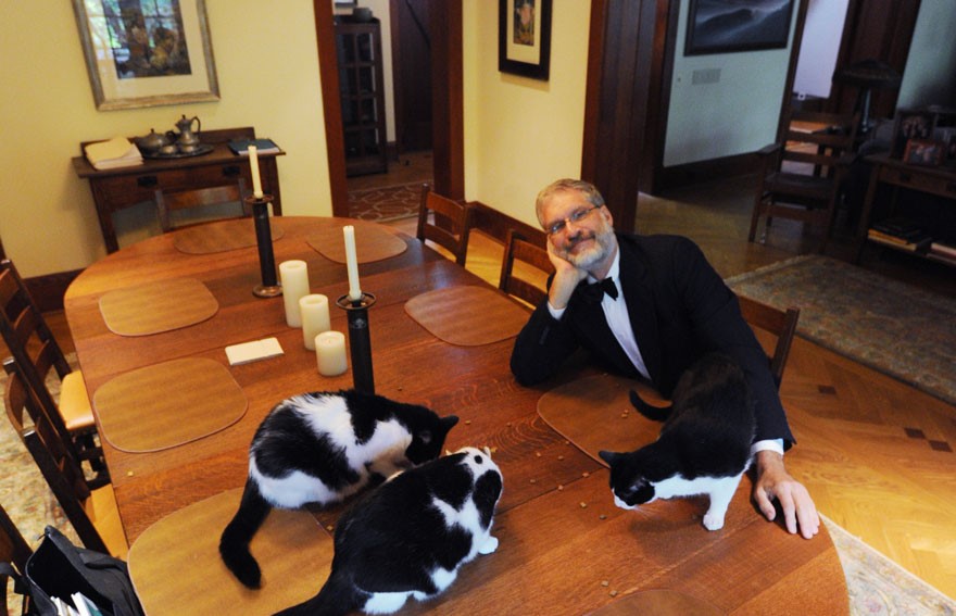 En í þó nokkuð langan tíma núna þá hefur hann haldið fín matarboð þegar hún er ekki heima – og það með köttum!