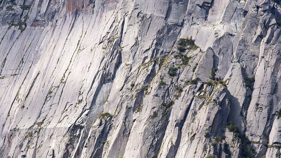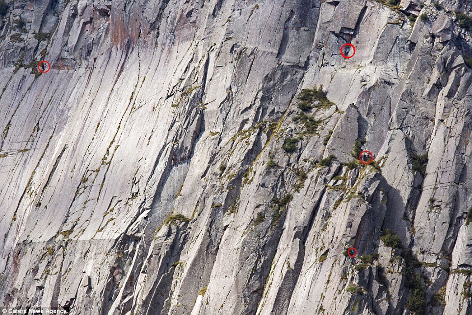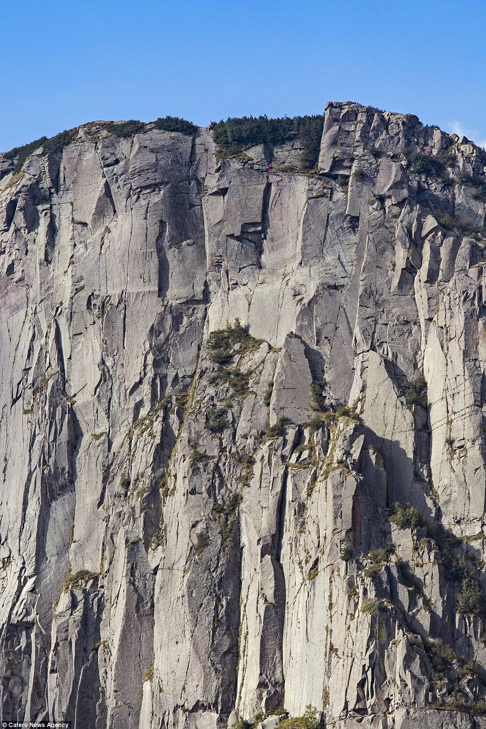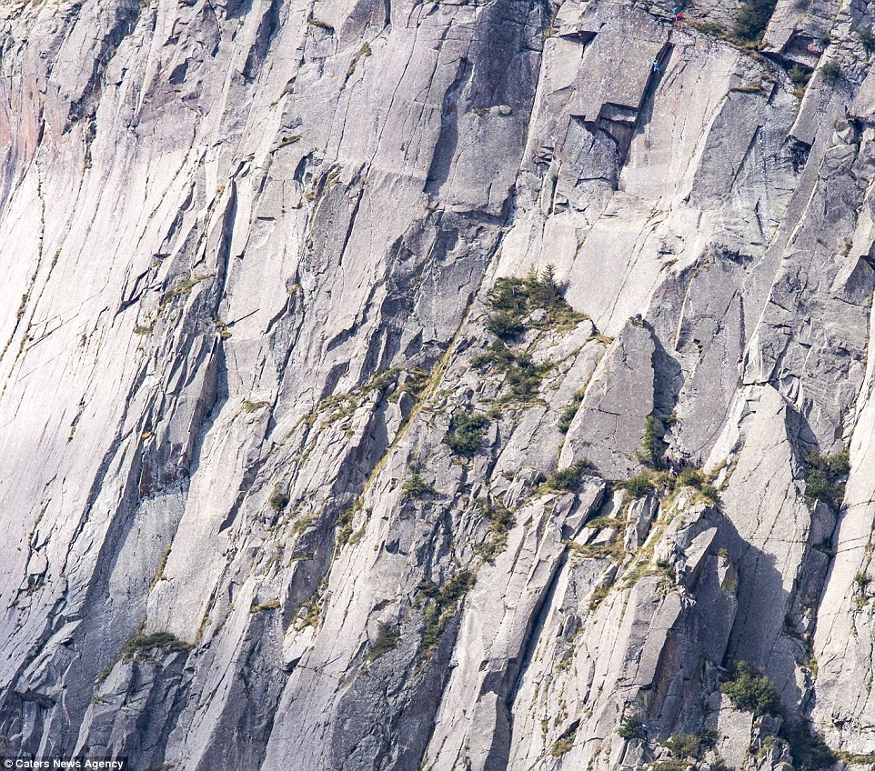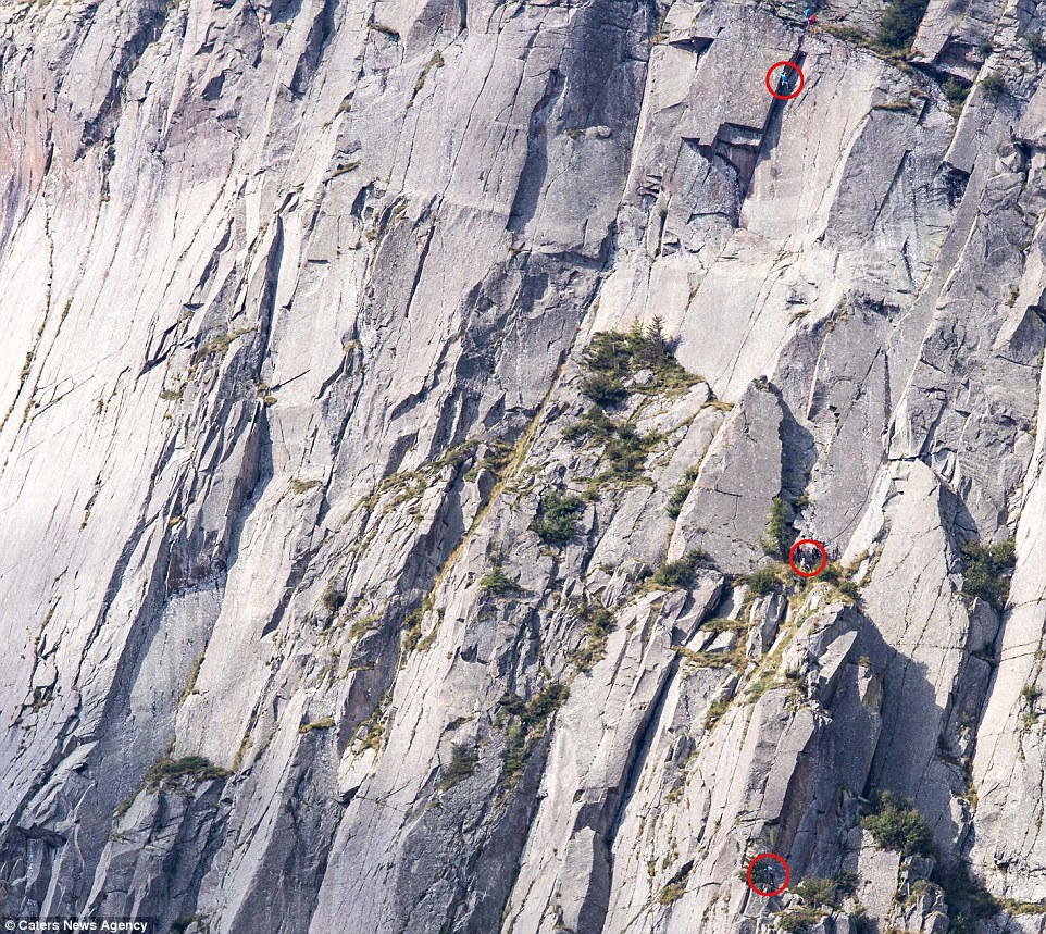 En þegar nánar er að gáð má sjá á henni þrjá snar geðveika menn sem eru að gera tilraun til að príla þetta klettabelti.